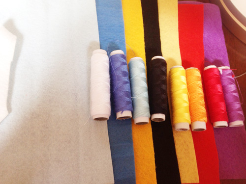 フェルト(白・水・黄・黒・朱・紫)+その色の糸